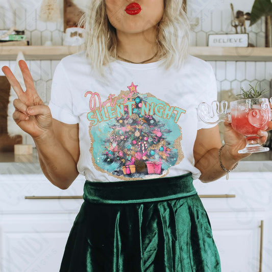 Not So Silent Night Sublimation Design PNG Digital Downloads DTG Printable Design Gold Christmas Tree Pink Turquoise