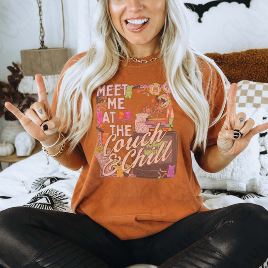 Meet Me at the Couch and Chill Sublimation Design PNG Digital Download Halloween Treats TV Fright Night