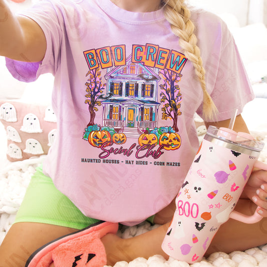 Boo Crew Pink Sublimation Design PNG Digital Download Printable Halloween Haunted House Bat Pumpkins