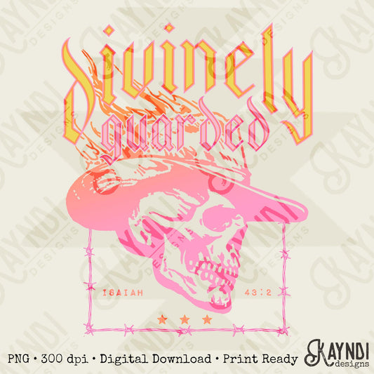 Divinely Guarded Sublimation Design PNG Digital Download Printable Southern Western Grunge Rock Christian Faith Based Cowboy Hat Skull Flame