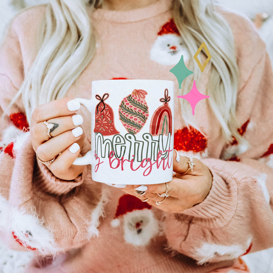 Merry & Bright Sublimation Design PNG Digital Download Printable Christmas Ornaments Merry Christmas Cute Girly Pink Green Winter Trendy