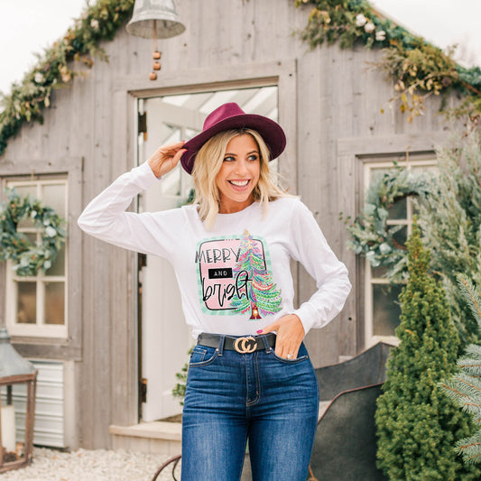 Merry & Bright Sublimation Design PNG Digital Download Printable Preppy Christmas Tree Merry Christmas Cute Girly Pink Green Winter Trendy