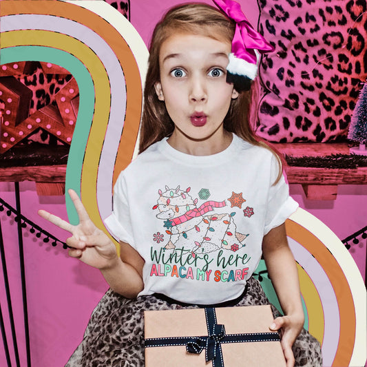Winter's Here Alpaca My Scarf Sublimation Design PNG Digital Download Printable Cute Girls Kids Pink Christmas Snow Flakes Christmas Lights