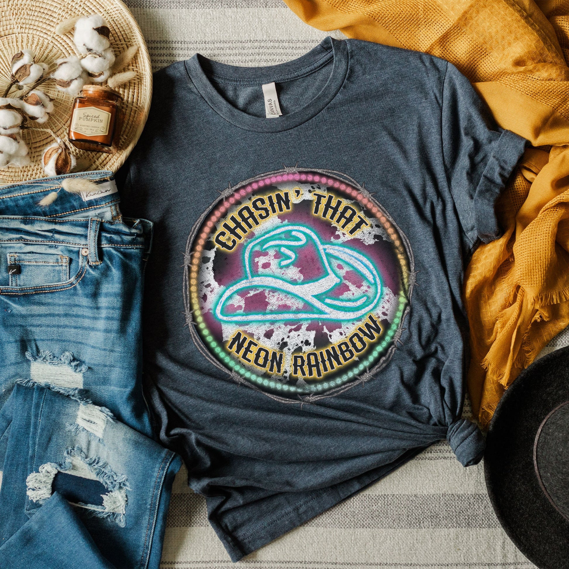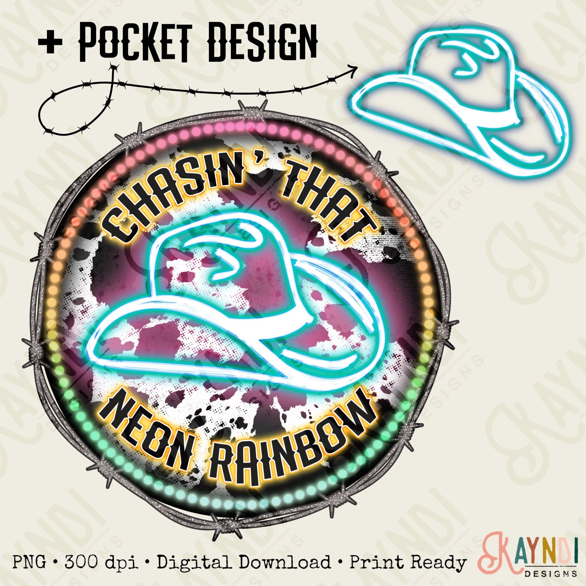 Chasin That Neon Rainbow plus Pocket Design Blue Sublimation Design PNG Digital Download Printable Cowboy Hat Cow Print Western 90s Country