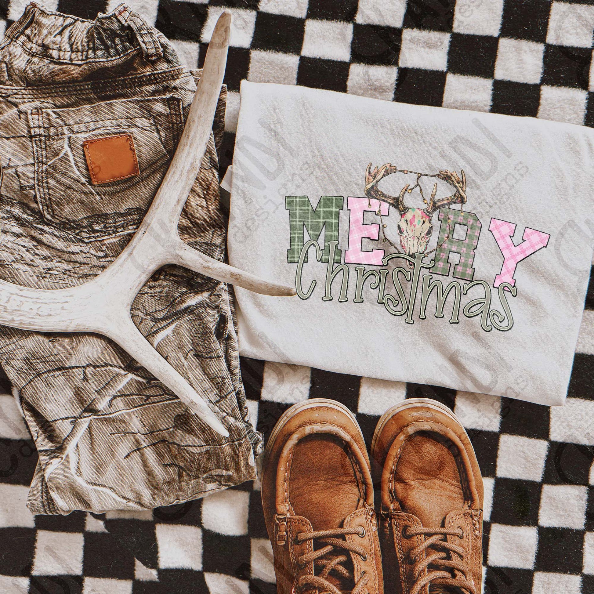 Christmas Christmas Deer Skull Sublimation Design PNG Digital Download Merry Christmas Green Pink Checkered