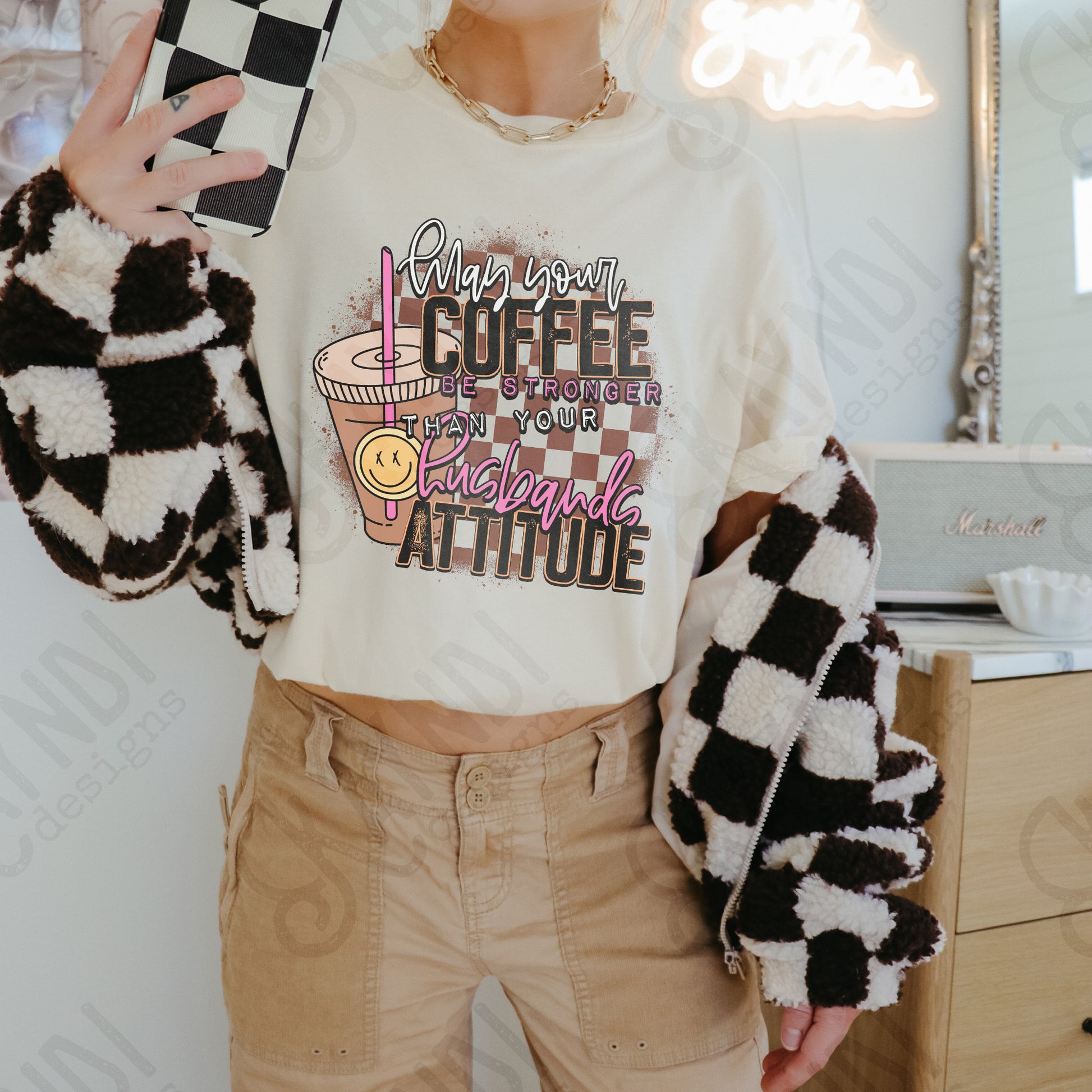 Coffee Be Stronger Than Your Husbands Attitude Sublimation Design PNG Digital Download Printable Checkered Caffeine