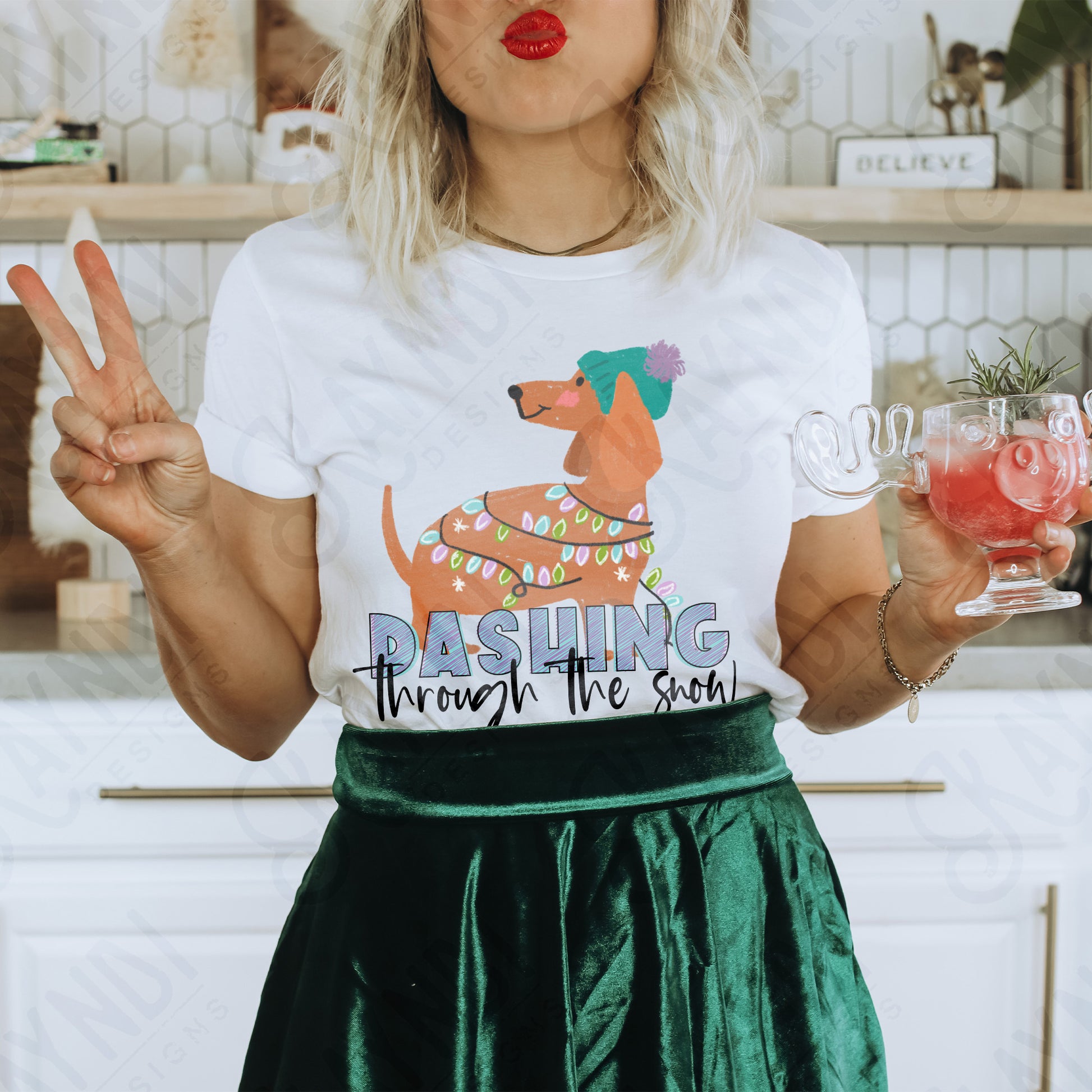 Dashing Through The Snow Sublimation Design PNG Digital Download Printable Dachshund Weenie Weenier Dog Christmas Lights Winter Cute Girls
