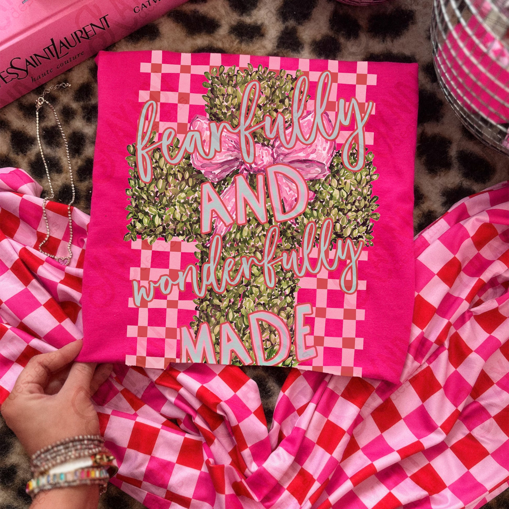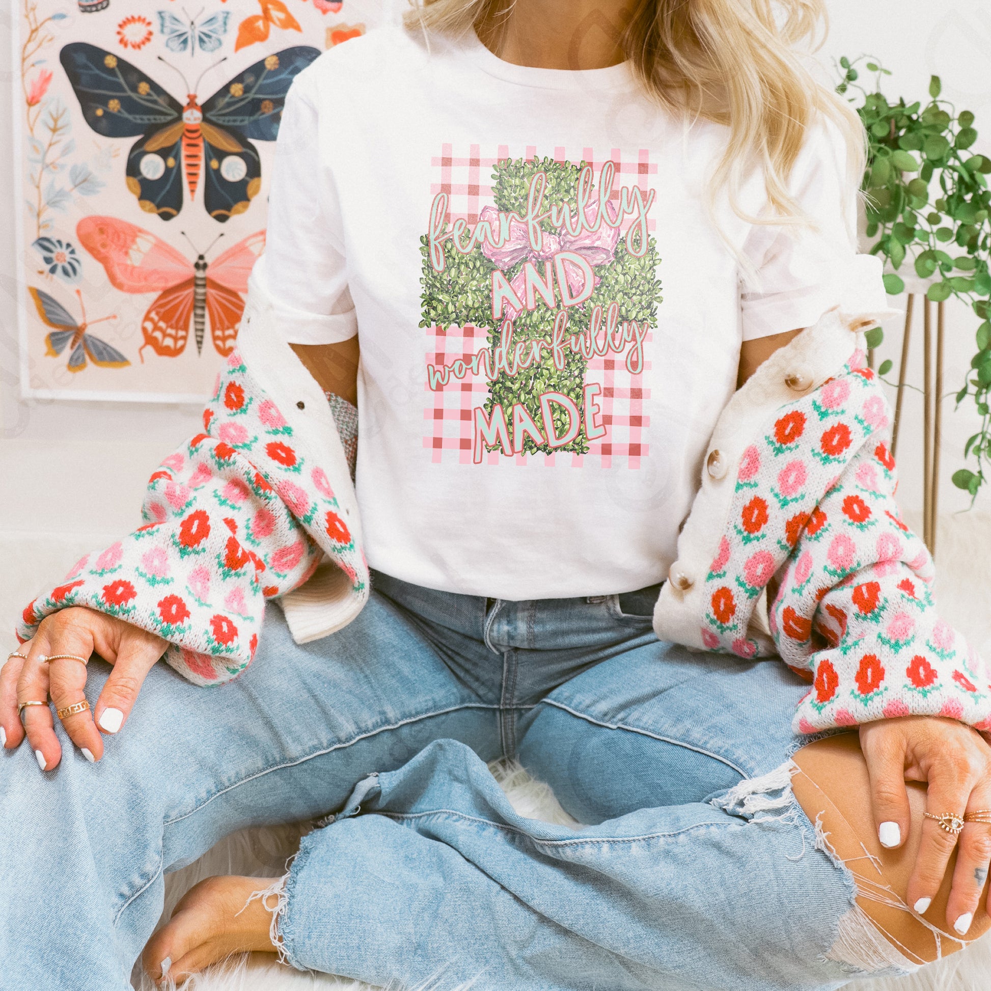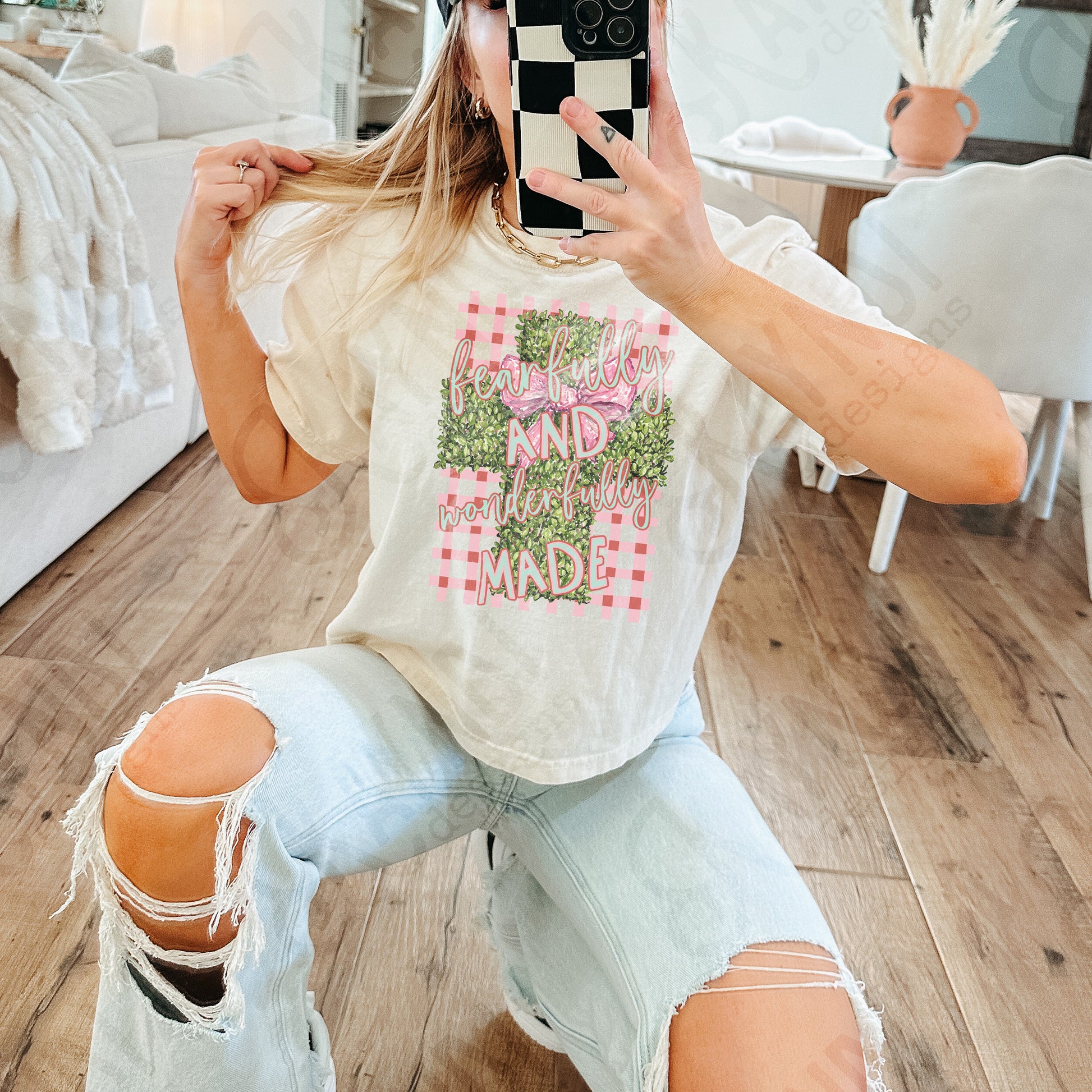 Fearfully and Wonderfully Made Sublimation Design PNG Digital Download Plaid Greenery Cross