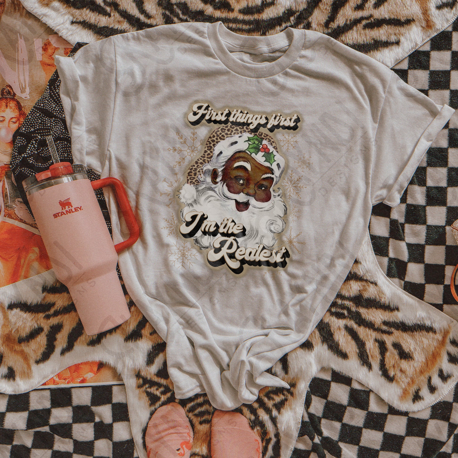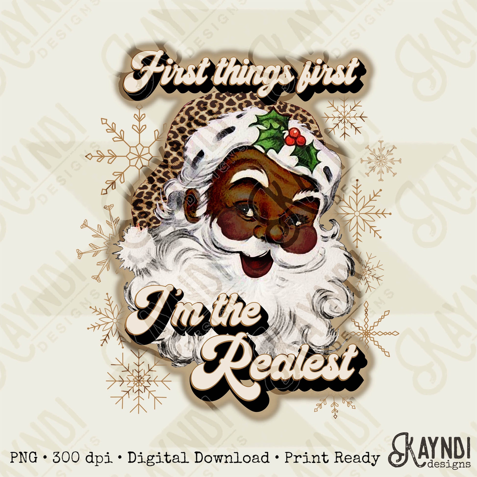 First Things First Im The Realest Santa Sublimation Design PNG Digital Download Printable Leopard Cheetah Beige Snowflakes African American