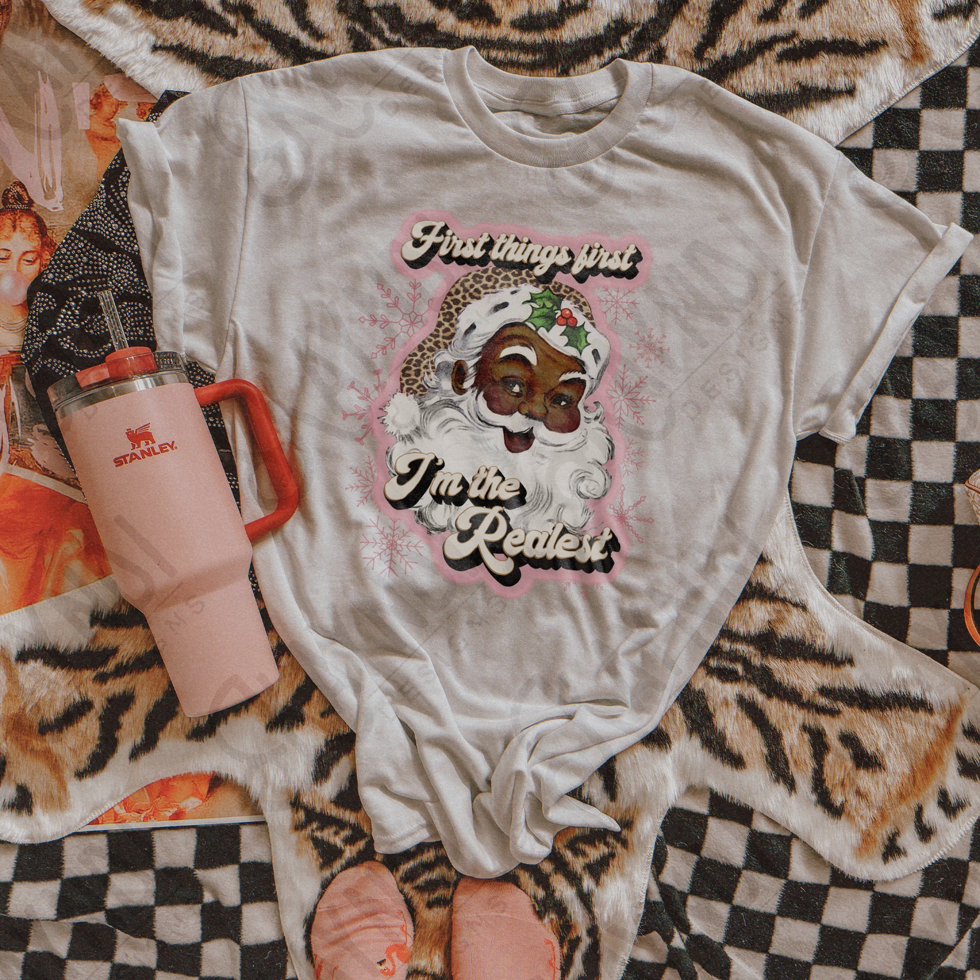 First Things First Im The Realest Santa Sublimation Design PNG Digital Download Printable Leopard Cheetah Pink Snowflakes African American