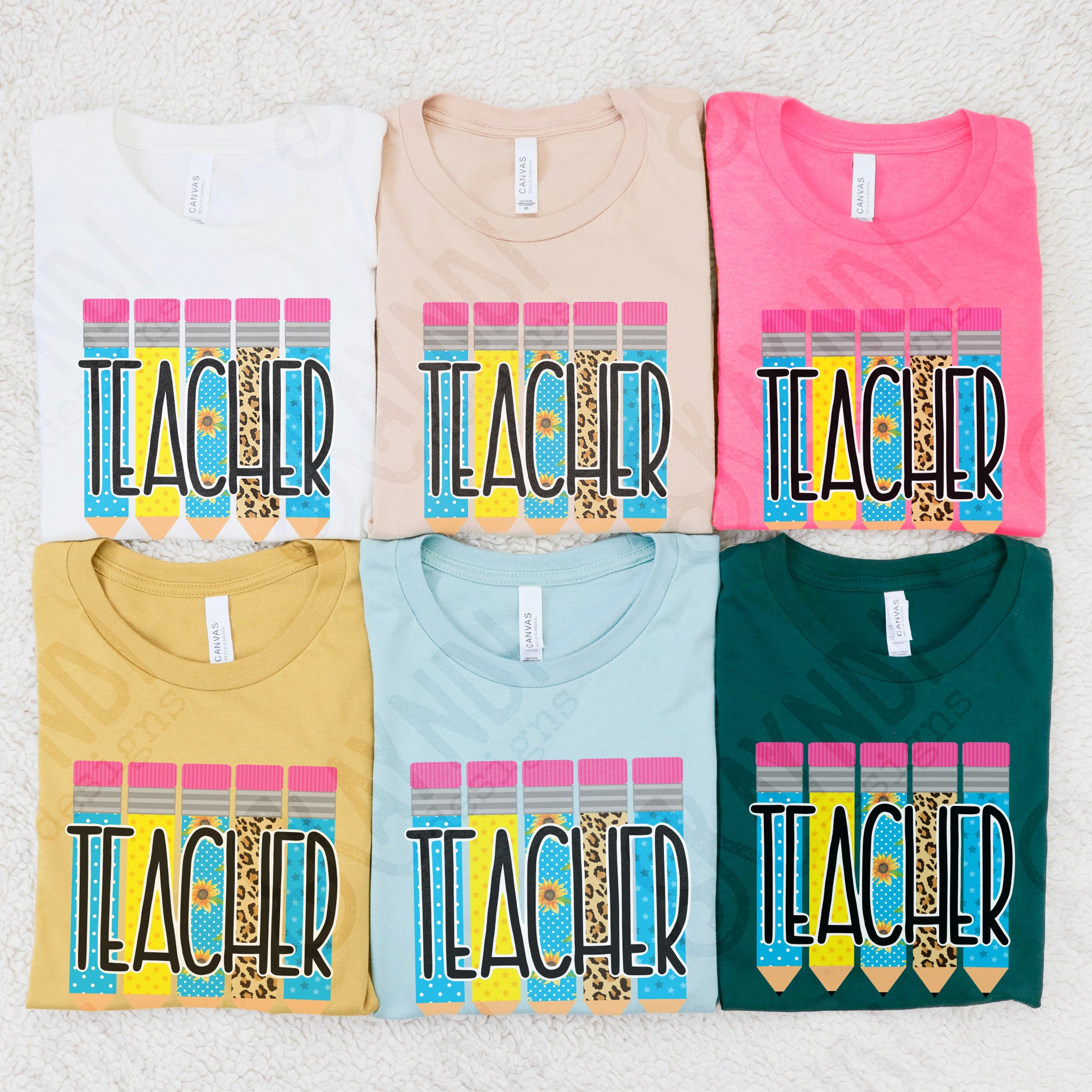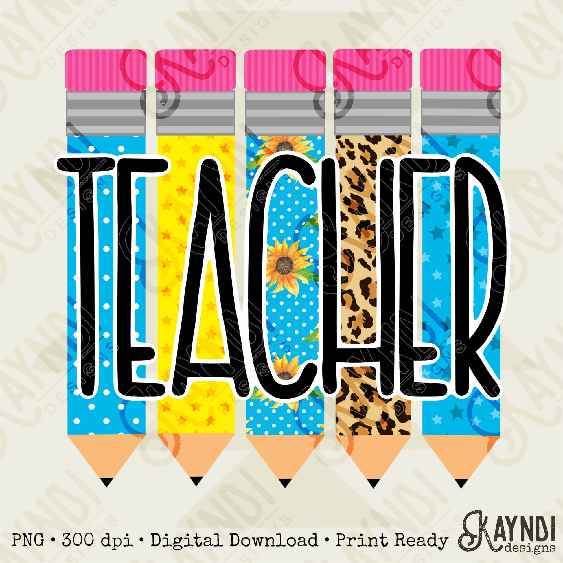 Teacher Pencils Sublimation Design PNG Digital Download Printable Blue Sunflowers Polka Dots Leopard