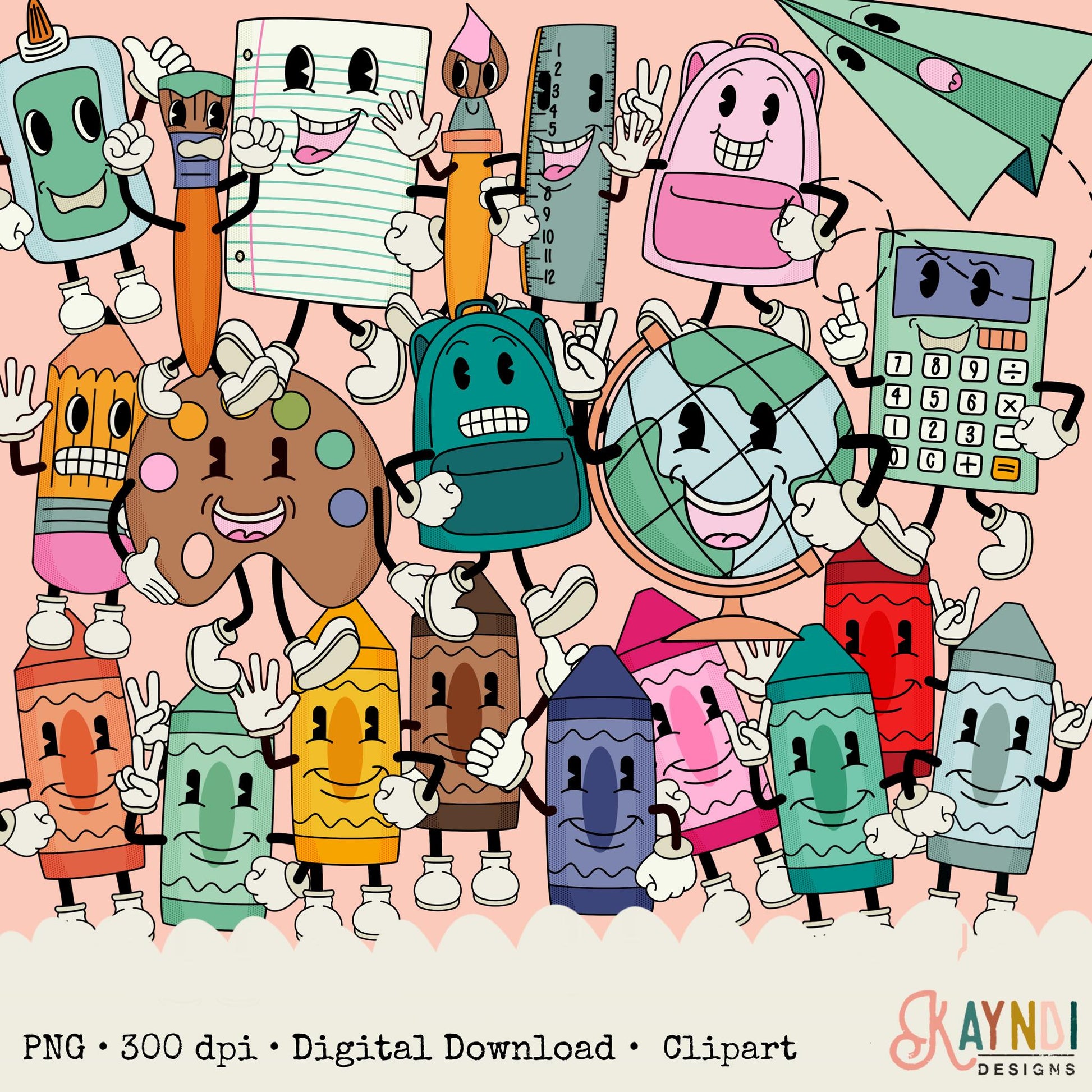 Hand Drawn School Supplies Cartoon Clipart Element PNG Digital Downloads Elements Retro Commercial Use
