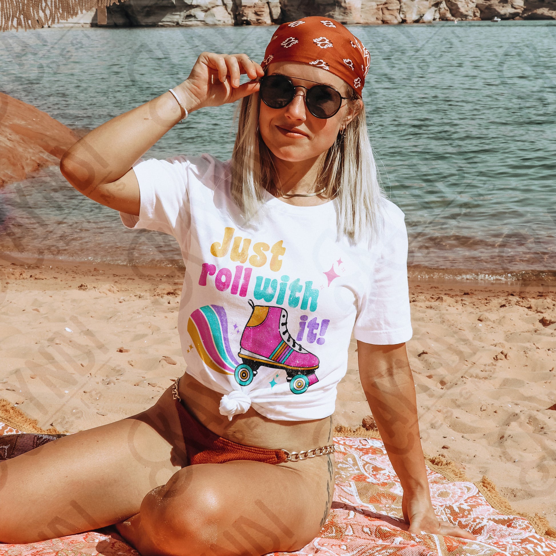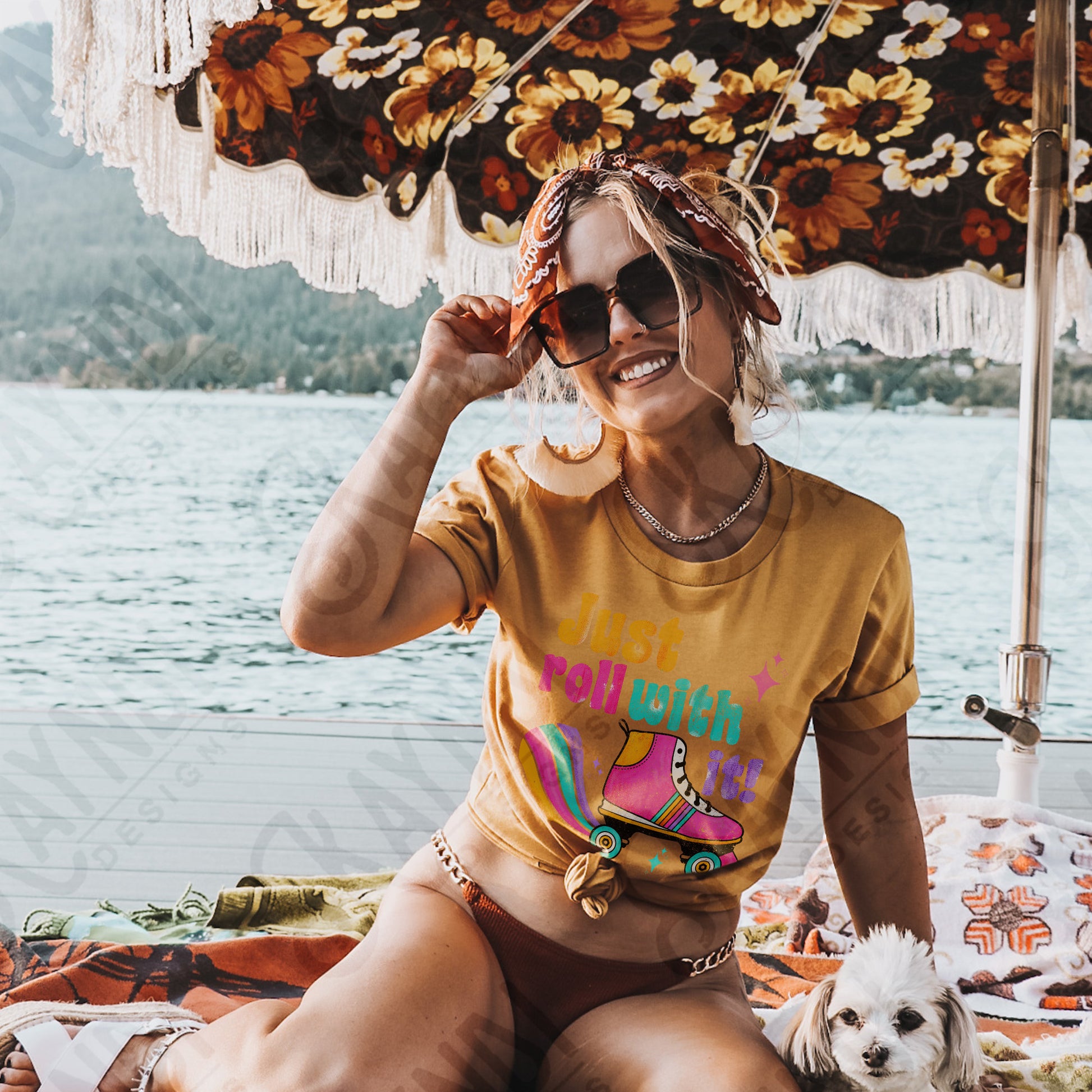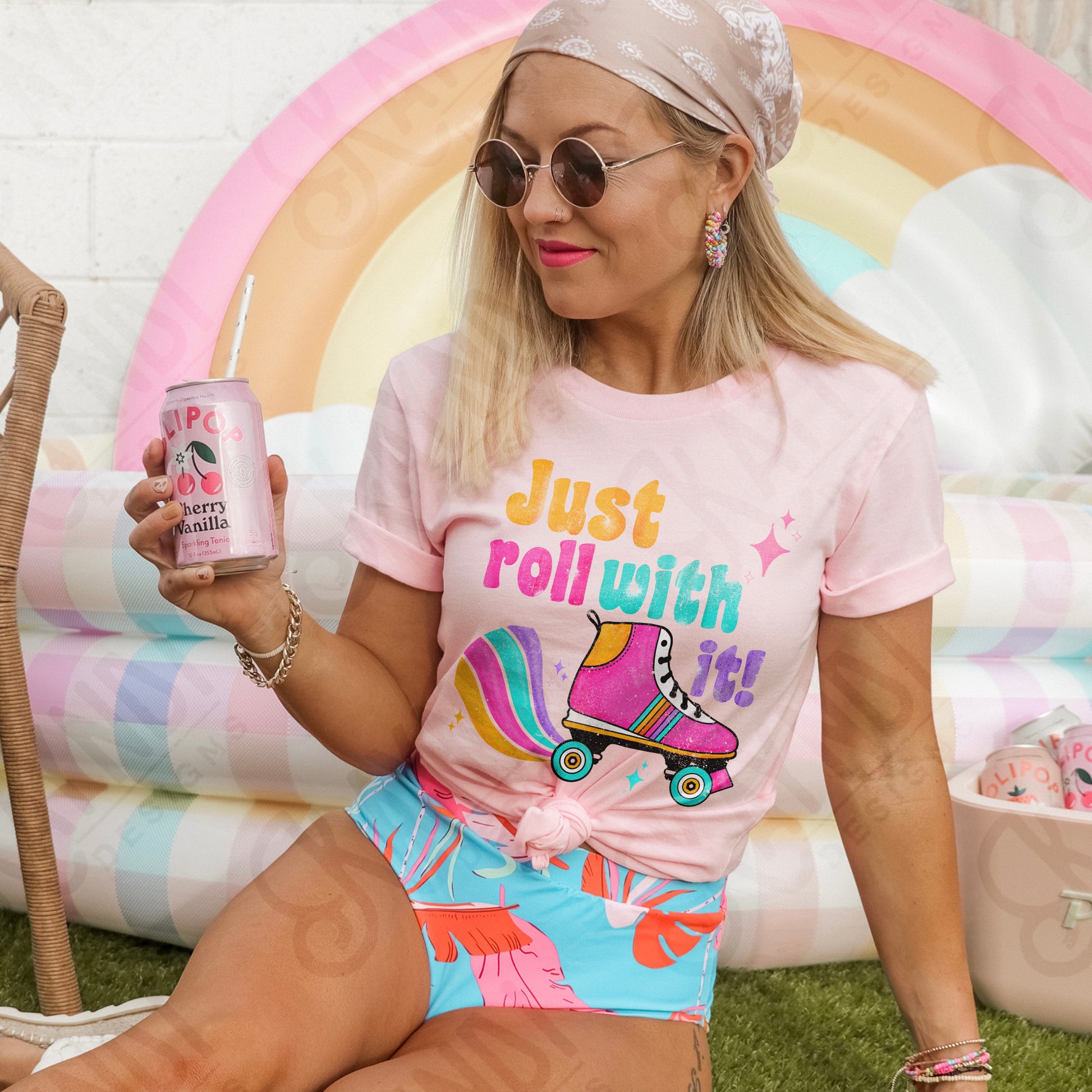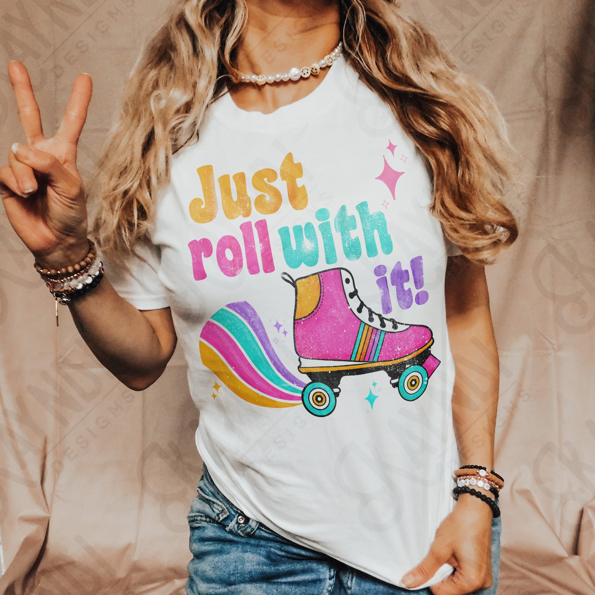 Just Roll With It Sublimation Design PNG Digital Download Printable 70s 80s Retro Vintage Doodle Rollerblades Roller Skates Skating Rink