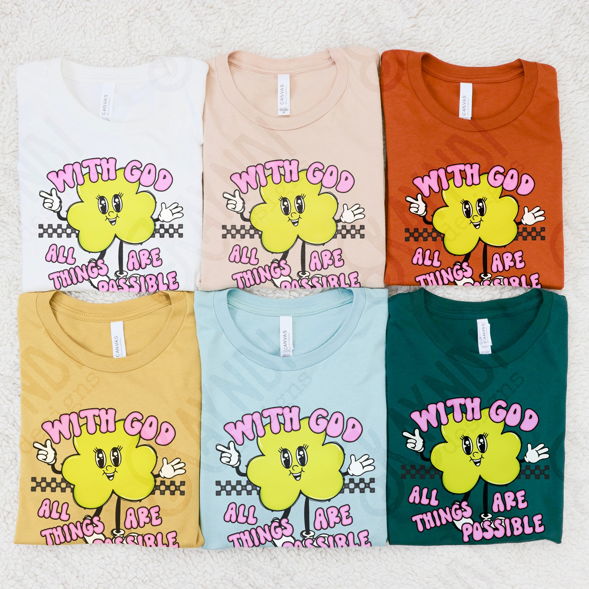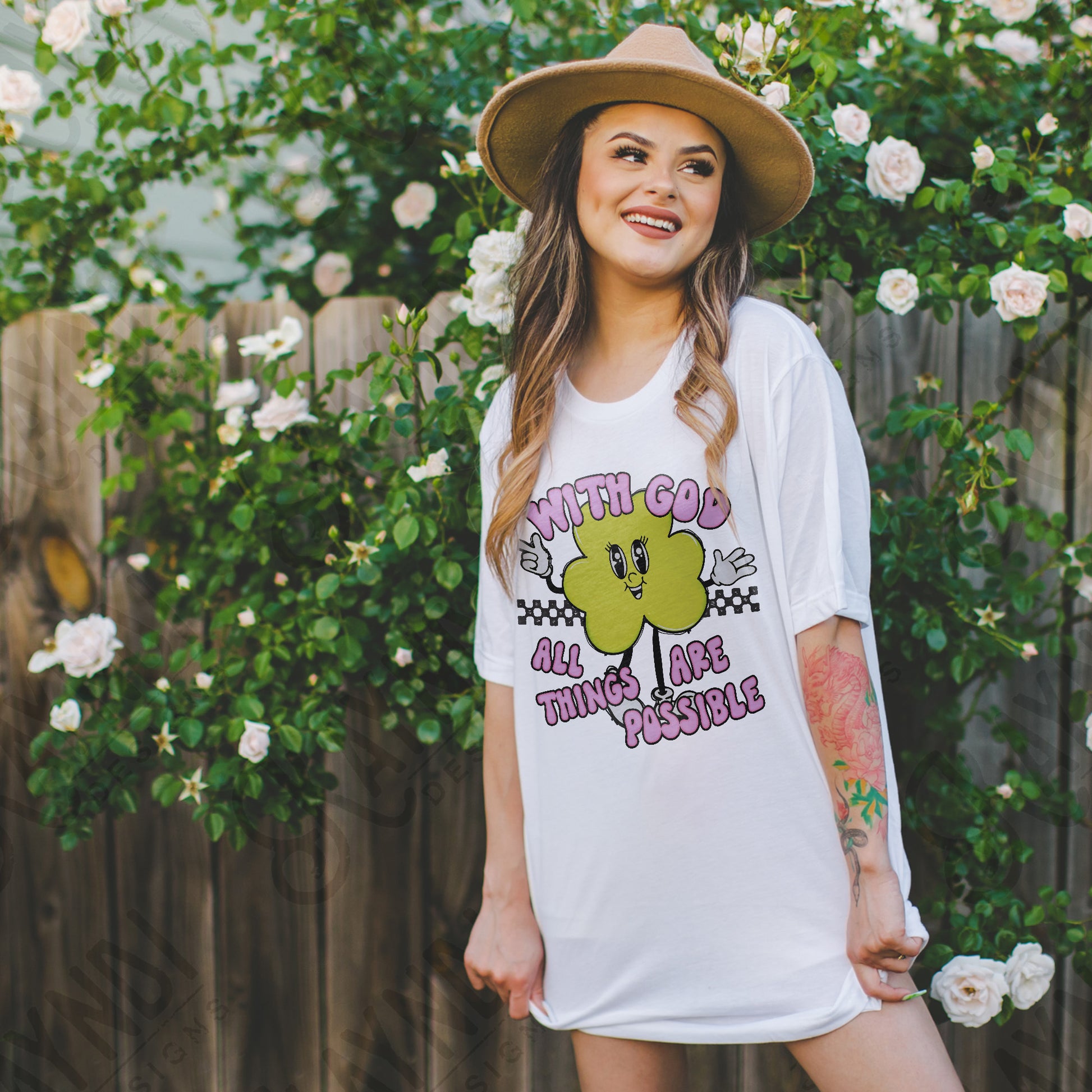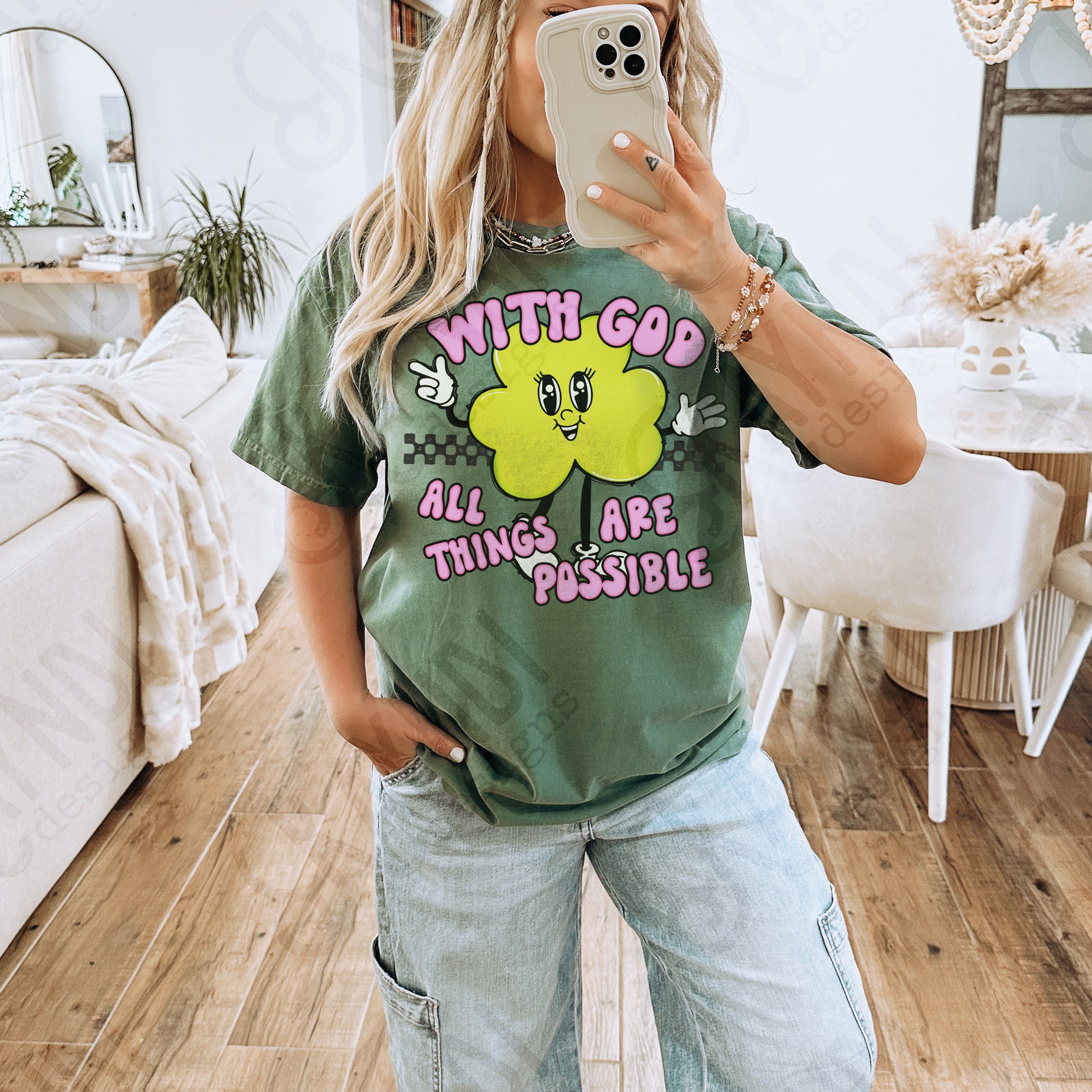 With God All Things are Possible Sublimation Design PNG Digital Download Printable Retro Groovy Checkered Clover